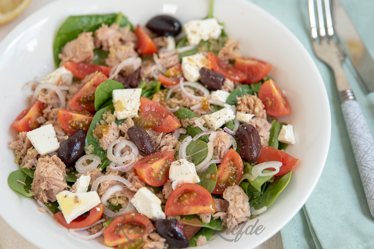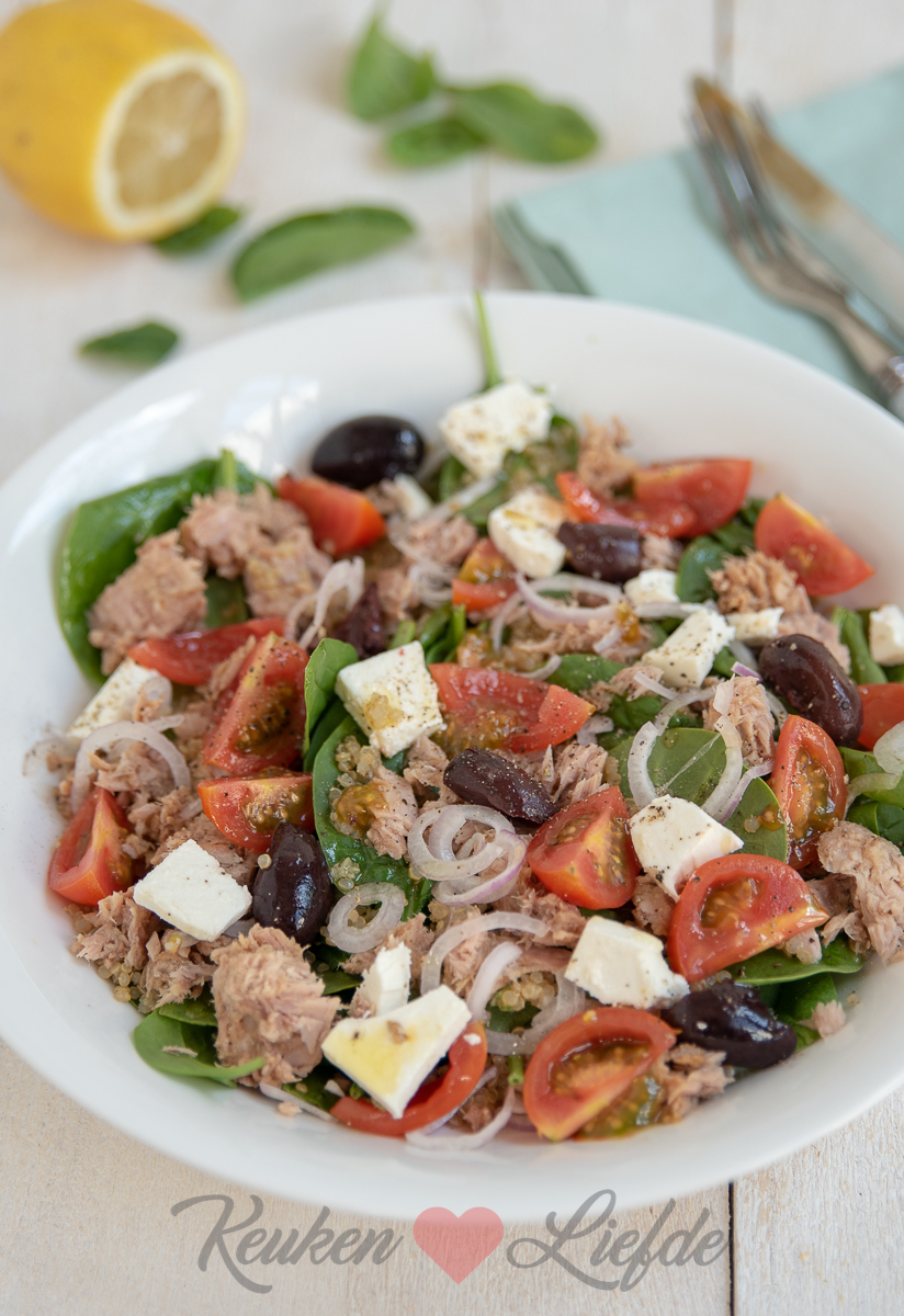 Deze spinaziesalade met quinoa, tonijn en feta kun je zowel als lunch of als licht hoofdgerecht eten. Als je hem als hoofdgerecht eet is het lekker om er wat knapperig stokbrood bij te serveren.