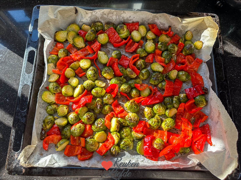 De spruitjes worden in dit recept niet gekookt maar geroosterd in de oven, samen met zoete puntpaprika. Zo houden ze een lekkere smaak en bite. De zoete puntpaprika zorgt voor wat kleur en smaakt na het roosteren lekker zoet.