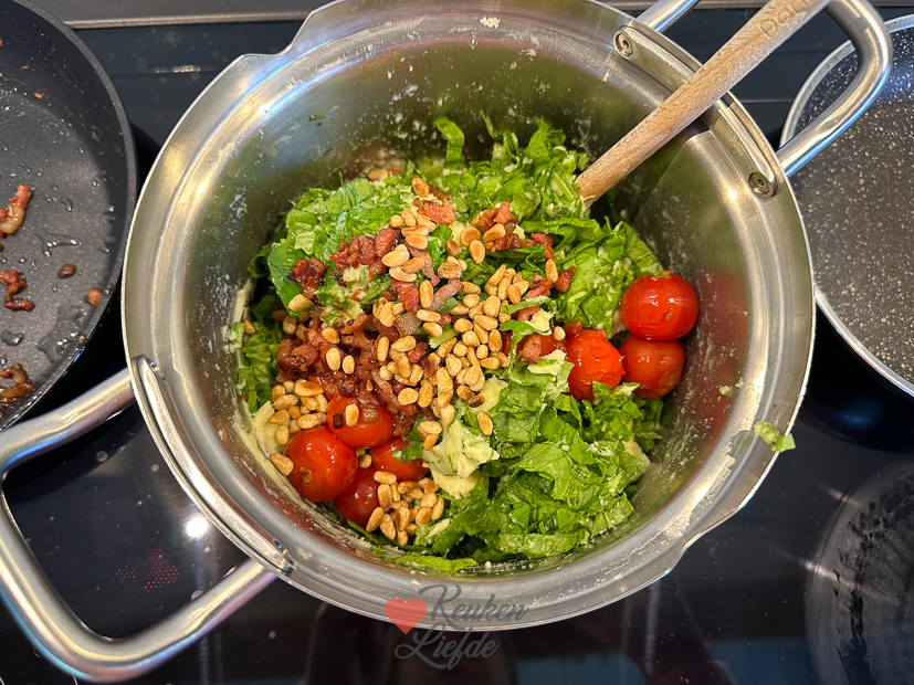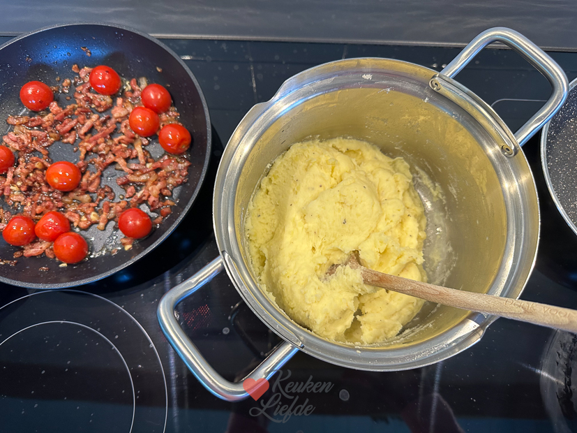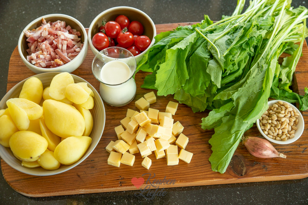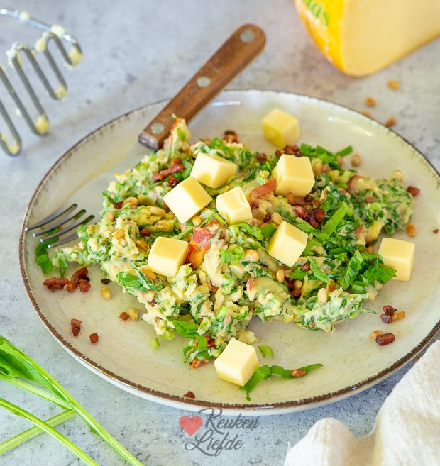 Een voorjaarsstamppot met raapstelen, graskaas en spekjes. Raapstelen zijn een voorjaarsgroente die je qua smaak een beetje kunt vergelijken met spinazie en rucola. De jonge, frisse blaadjes en steeltjes zijn knapperig en licht pittig van smaak. Als ik ze zie liggen in de winkel twijfel ik geen moment. Die gaan mee naar huis! Onlangs kreeg ik van Hoogendoorn Kaas een mooi stuk graskaas en ik besluit de raapstelen en graskaas samen te verwerken in een heerlijke voorjaarsstamppot. Met wat geroosterde pijnboompitjes en cherrytomaatjes geef ik er een heerlijke Italiaanse draai aan.