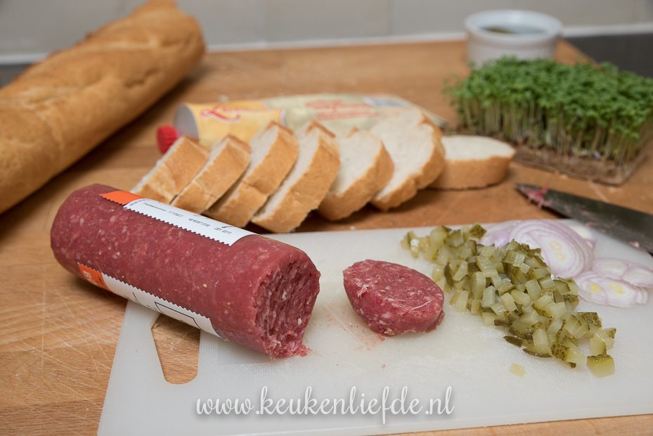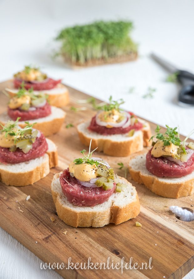 Garneer met een toef pittige mayonaise, sjalot, augurk en tuinkers. Bestrooi met wat zout en peper uit de molen.