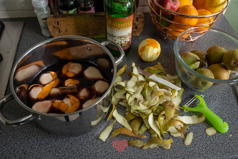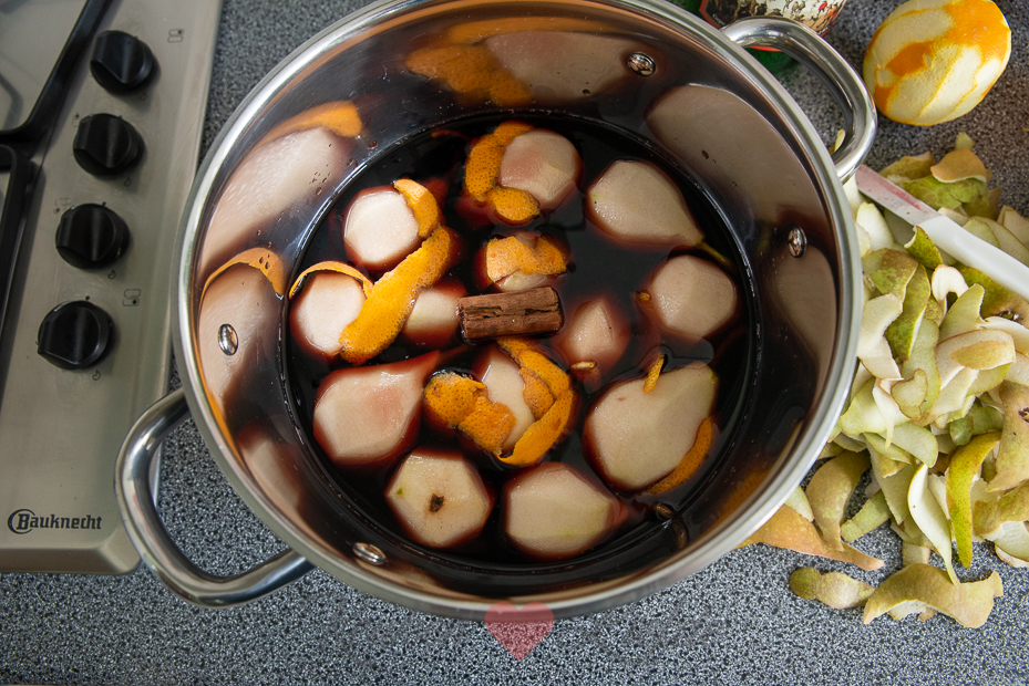 Kook het stoofperenvocht in een pannetje op hoog vuur in, tot het wat dikker en stroopachtig begint te worden. Strijk dit met een kwastje over de stoofperen, zo gaan ze mooi glanzen.