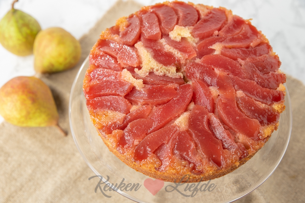 De eerste keer dat ik deze cake maakte haalde ik hem te vroeg uit de oven waardoor hij inzakte. Bij de tweede poging bakte ik hem een uur in de oven en lukte hij wel. De tweede keer waren de zelfgemaakte peren op en gebruikte ik stoofperen uit een pot. Vandaar het verschil tussen de bereidingsfoto’s en het eindresultaat.