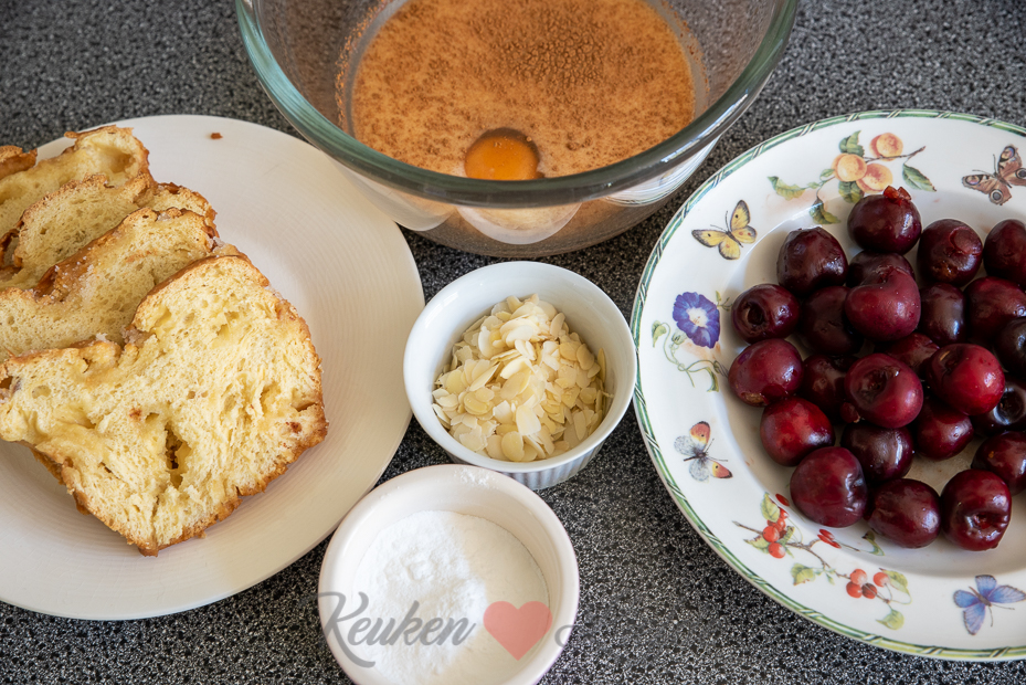 Serveer de suikerbroodwentelteefjes met de warme kersen en siroop en bestrooi met de geroosterde amandelen. Lekker met een dot lobbig geklopte slagroom.