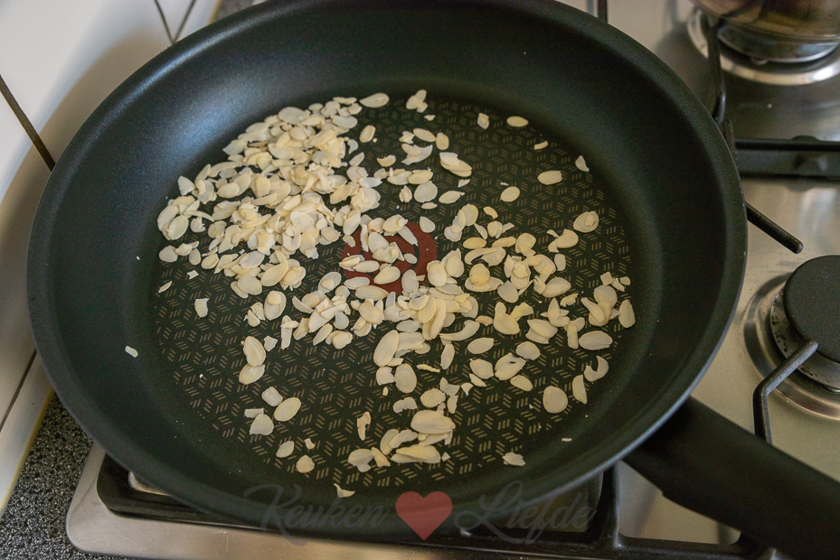 Verhit de koekenpan. Strooi de amandelen in de pan en laat ze op middelhoog vuur goudbruin kleuren. Schep regelmatig om. Schuif de amandelen op een bord en zet opzij.