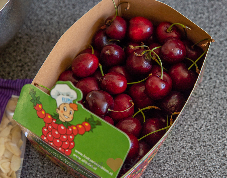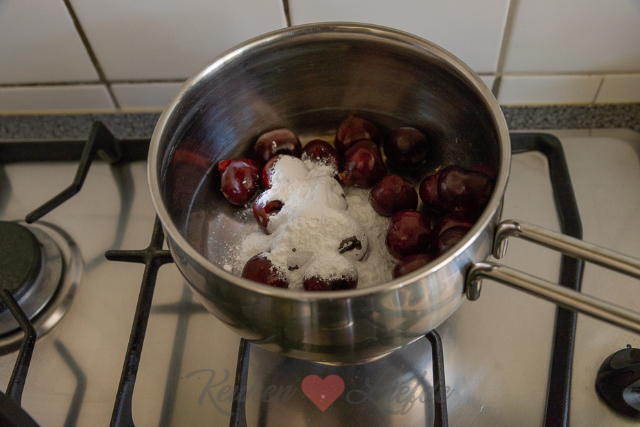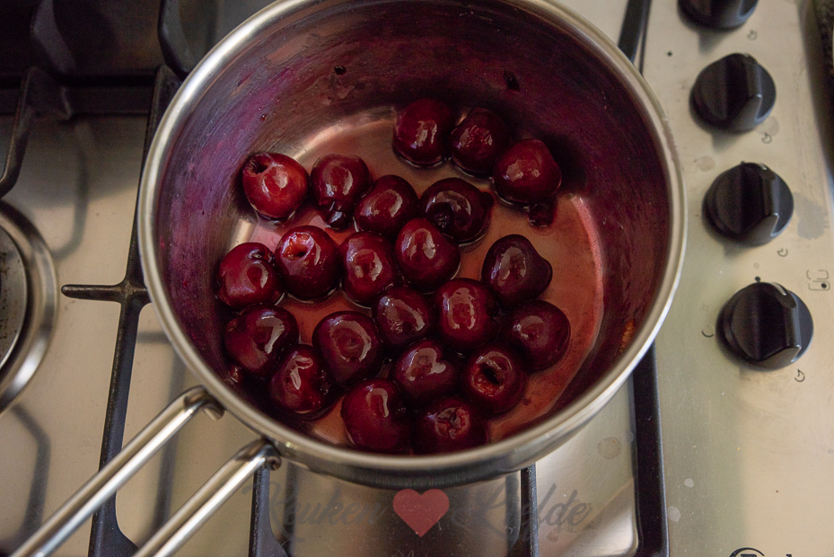 Was de kersen en ontpit ze. Verwarm de kersen samen met de suiker en het citroensap op middelhoog vuur tot de suiker is opgelost en samen met het vrijgekomen kersensap een laagje siroop vormt op de bodem van de pan. Zet het vuur uit en doe de deksel op de pan om ze warm te houden.
