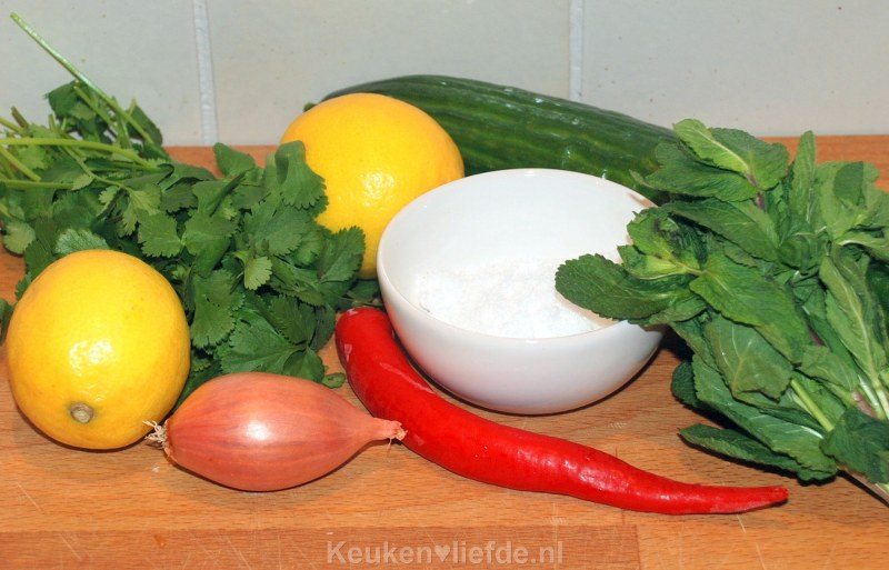 In de komkommersalade doe ik bij voorkeur ook fijn gestampte koriander wortel en klein gehakt kafirlimeblad of het sap van een djeroek peroet. Ik kook sereh in de dressing mee of voeg verse kleine ringetjes sereh toe aan de salade.