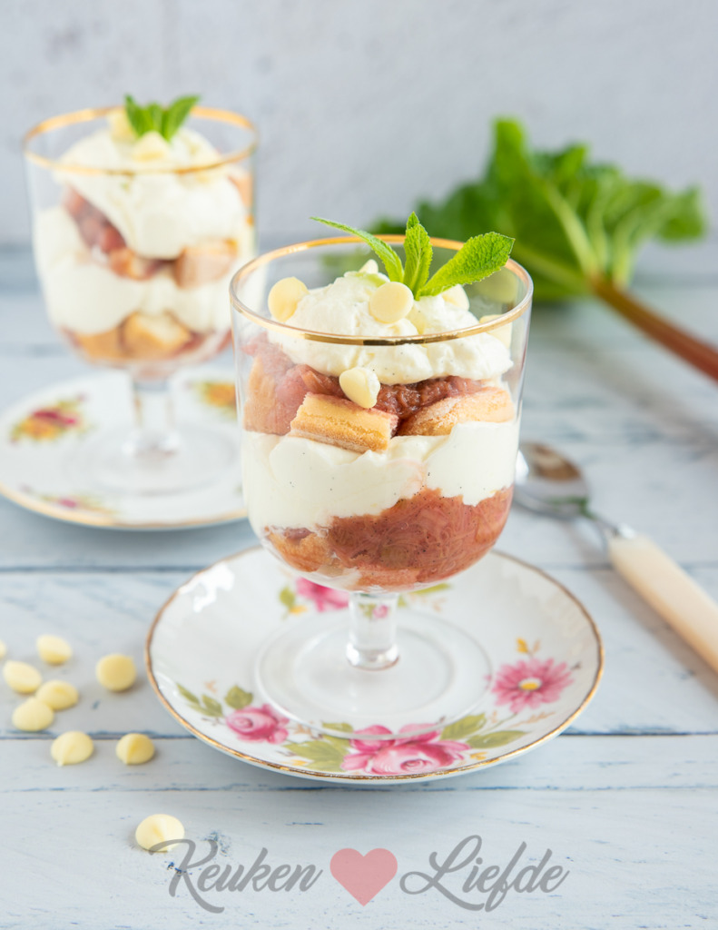 Gebruik jij weleens rabarber in je keuken? Ik ben dol op die friszure, roodgroene stengels! Dit keer maak ik er compote van en verwerk die in een heerlijk Italiaans dessert: tiramisu! Door de tiramisu in glaasjes te serveren kun je alle laagjes zien. Een feestelijk dessert en heel makkelijk om te maken!