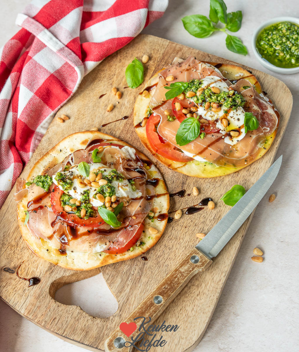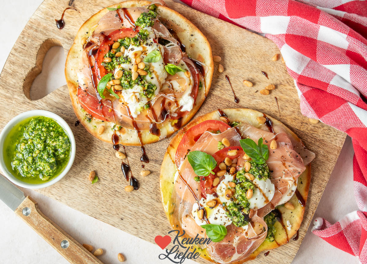 Deze tostada caprese is een smakelijke fusion van de Mexicaanse en Italiaanse keuken. Een krokant gebakken tortillawrap belegd met Italiaanse smaken als tomaat, mozzarella, pesto en parmaham. Heerlijk als lunchgerecht maar ook erg lekker als avondeten met een kommetje soep erbij.