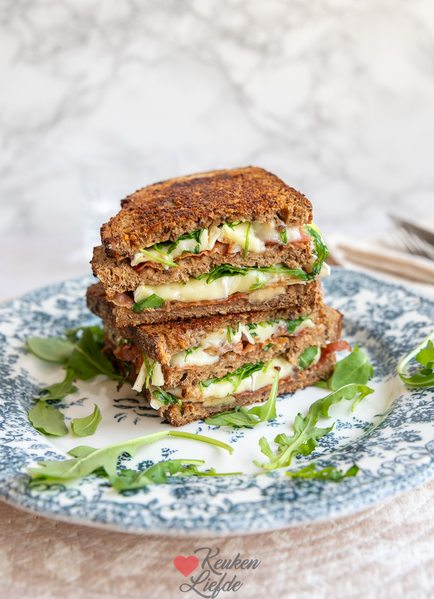 Een tosti met brie is echt comfort food als je het mij vraagt. De romige en zacht smeltende kaas gecombineerd met het knapperig, gezouten spek, walnoten en honing is verrukkelijk! Het handje rucola geeft een lekkere, kruidige smaak.