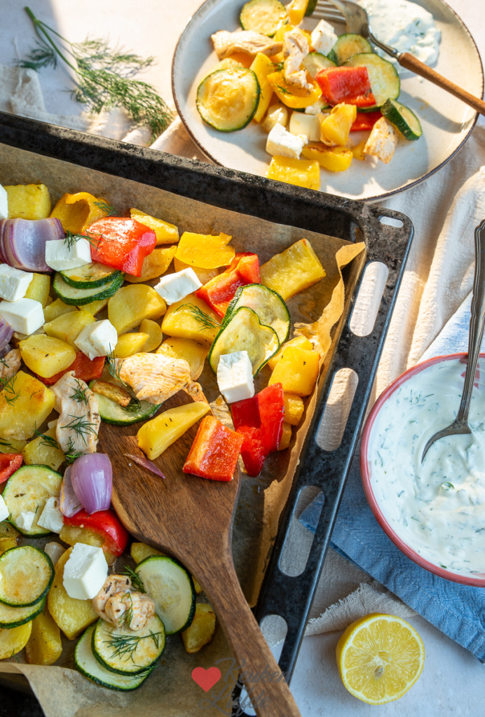 Ik vind het lekker als de feta een beetje warm is maar op het eind erop doen kan natuurlijk ook. De knoflook wordt lekker zacht en mild van smaak en kun je naderhand zo uit het velletje knijpen en opeten.