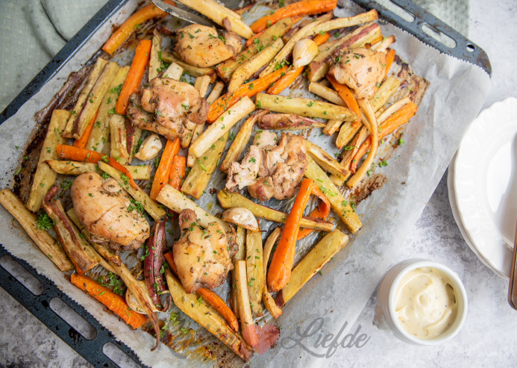 Makkelijker dan een traybake wordt het avondeten niet. Veel lekkerder trouwens ook niet, want geroosterde groenten van het bakblik zitten bomvol smaak. Met een traybake kun je eindeloos variëren. Ik kies dit keer voor groenten als pastinaak, zoete aardappel en winterpeen omdat die nu volop verkrijgbaar zijn. Om er een complete maaltijd van te maken voeg ik kippendijen toe. Die hebben dezelfde bereidingstijd als de groenten en blijven lekker sappig. Ik serveer de traybake graag met een aangemaakte groene salade met pittenmix, of een knolselderijsalade. Een lik truffelmayonaise maakt het smulfeest compleet!
