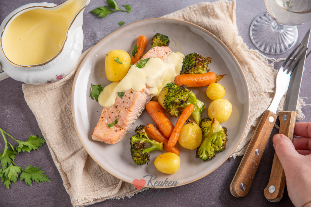 Als ik naar de foto’s van dit gerecht kijk, loopt het water me weer in de mond. Deze traybake met krieltjes, groenten en zalm is verrukkelijk! Supersimpel om te maken en snel klaar. Ik serveer de traybake met hollandaisesaus maar je kunt er ook een andere saus naar keuze bij serveren. Hollandaisesaus smaakt hier wel heel goed bij.
