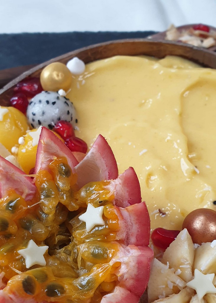 Hier kun je het zo gek maken als je zelf wilt. De smoothie smaakt best tropisch en romig, daarom koos ik voor kokosrasp, passievrucht (ook tropisch, maar juist lekker fris) en granaatappel (heeft een lekkere bite).