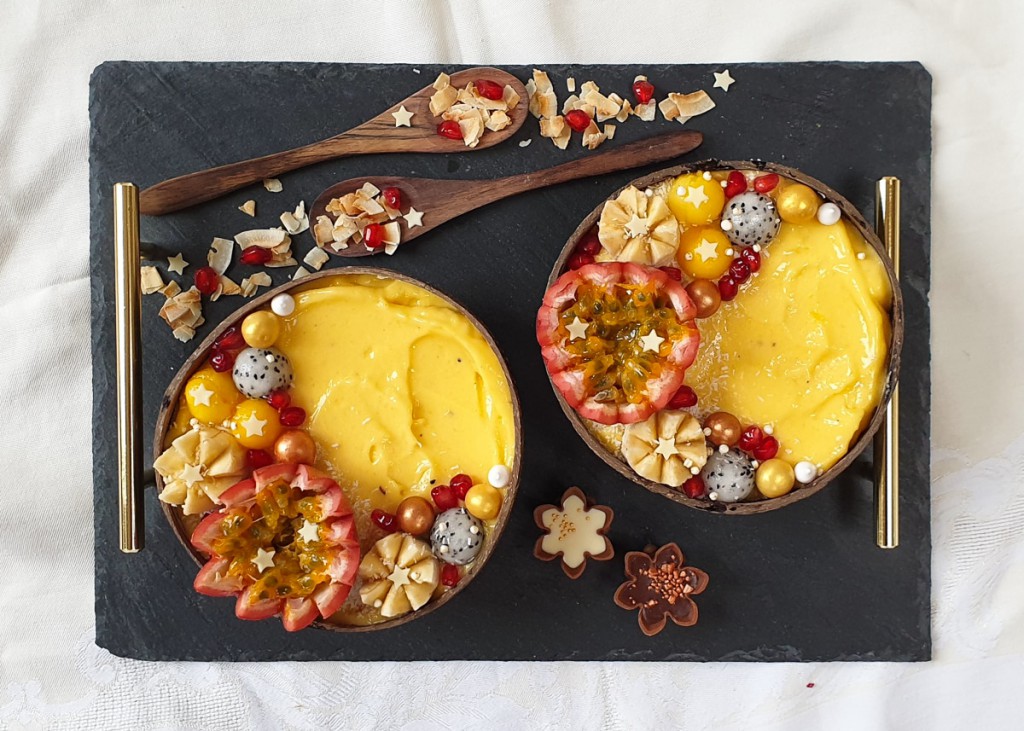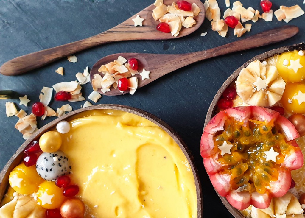 Vandaag deel ik met groot genoegen haar eerste recept, een tropische smoothiebowl met mango en ananas. Ik geef het woord aan Rebekka:
