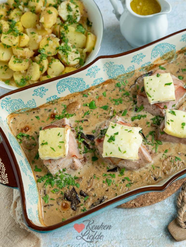 Varkenshaas met champignonroomsaus, wie is daar nou niet dol op! In dit recept gratineer ik de varkenshaas met bacon en brie in champignonroomsaus in de oven. Een heerlijk feestmaal! De champignonroomsaus kun je van tevoren al maken zodat je moment suprême snel klaar bent. Lekker om te serveren met gebakken aardappeltjes, of gekookte pasta. Lekkere groente om erbij te serveren zijn sperziebonen, courgette, sugarsnaps, spinazie en doperwten.