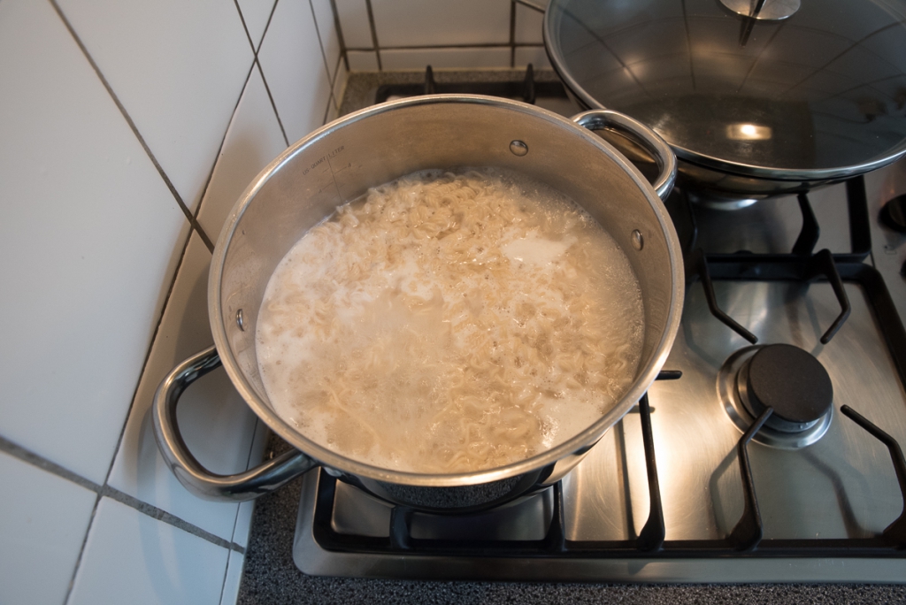 Kook de woknoedels gaar in een pan met water volgens de omschrijving op het pak. Giet af, spoel af met koud water en laat uitlekken. Als je de woknoedels niet direct gebruikt hussel ze dan om met een scheutje olie, om te voorkomen dat ze gaan plakken.