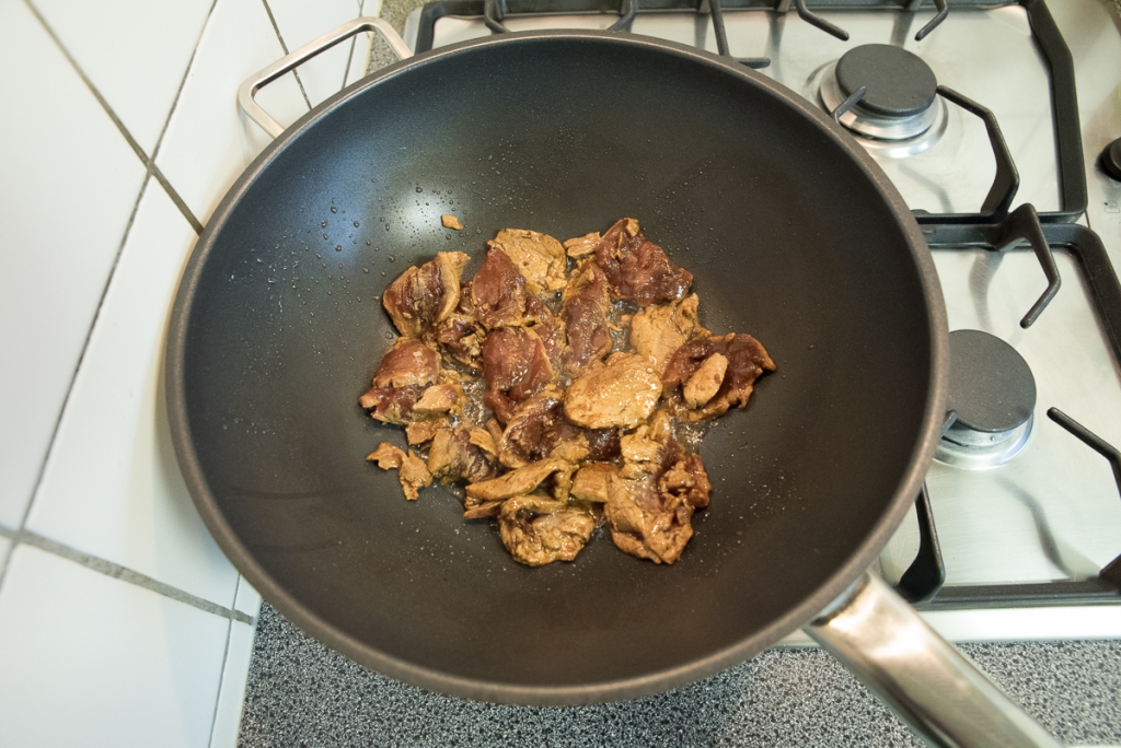 Verhit de wok met een scheutje zonnebloemolie (en optioneel een drupje sesamolie) en voeg de gemarineerde varkenshaas toe. Schroei het vlees op hoog vuur dicht in circa 1 à 2 minuten en schep uit de pan. Het geeft niet als het vlees nog niet helemaal gaar is want later gaart het nog verder in het gerecht. Zet opzij.