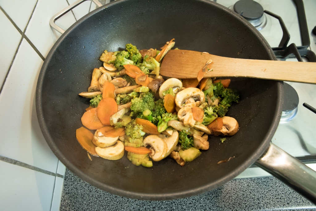 Verhit de wok opnieuw met een scheutje olie en voeg de broccoli en wortel toe. Roerbak circa 3 minuten op hoog vuur tot de groenten wat zachter zijn. Als de groenten te donker kleuren maar nog erg hard zijn voeg ik soms een scheutje water toe. Als het water verdampt is zijn de groenten vaak ook goed. Voeg de champignons toe en bak 1 minuut verder.