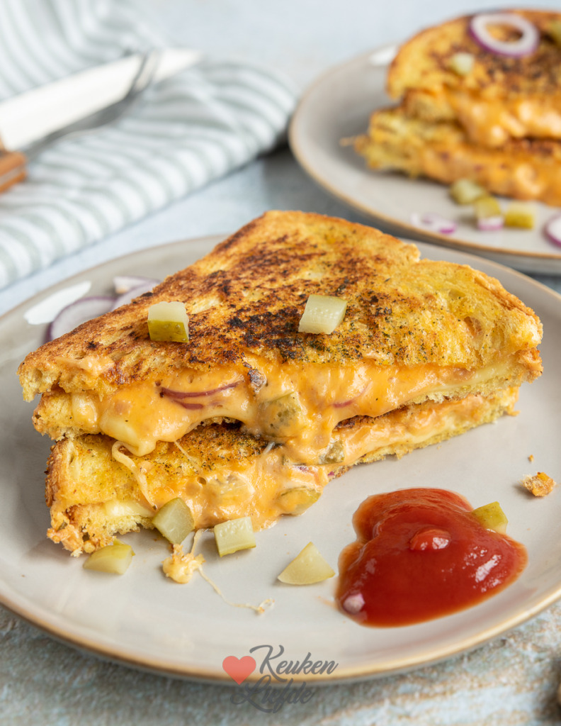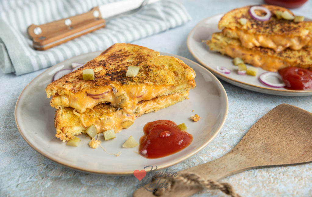 Voor KeukenLiefde krijg ik af en toe producten opgestuurd die ik zelf niet zo snel zou kopen. Vegan kaas en vegan tonijnsalade bijvoorbeeld. De vegan tonijnsalade had ik op een cracker gesmeerd en vond ik erg lekker. Aan de vegan kaas moest ik erg wennen. Kaaskop als ik ben kan er voor mij toch niks tippen aan echte kaas. Omdat ik ook benieuwd was naar de smelteigenschap van de vegan kaas maakte ik deze vegan tuna melt tosti. De vegan kaas smelt erg goed. Beter zelfs dan gewone kaas en transformeerde in een soort kaassaus. Jumm! Voor deze tosti vond ik dat een dikke plus. Ik bakte de tosti knapperig en goudbruin in de koekenpan, maar je kunt hem ook bakken in de oven (bovenkant van het brood besmeren met een beetje plantaardige boter), of in het tosti-ijzer.