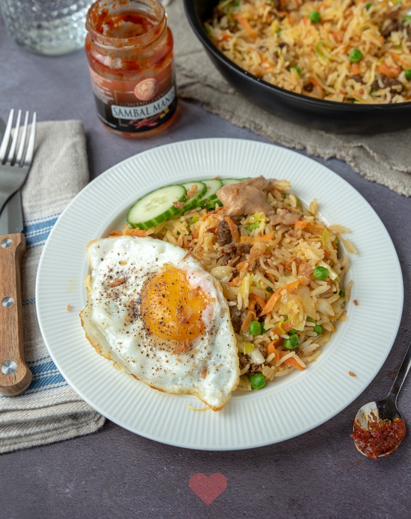 Heerlijke nasi goreng zonder vlees. Deze vegetarische nasi goreng maak ik met pulled oats en lekker veel verse groente. Je kunt ook een andere vegetarische vleesvervanger, of tofu gebruiken. Of maak hem alleen met groenten. Met de pindasaus, komkommer en het gebakken eitje erbij mis je het vlees geen seconde.