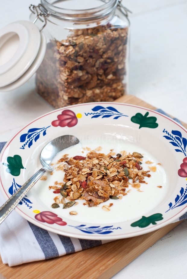Zojuist met dit recept mijn eerste granola gemaakt! Naar smaak wat dingetjes veranderd, geen walnoten maar pecan- en hazelnoten. Geen kokos maar wel wat extra pompoenpitten. Zit nu te genieten van een bakjes griekse yoghurt met de granola…Heerlijk! Gelukkig had ik al een vermoeden dat lekker zou zijn, heb maar meteen een dubbele hoeveelheid gemaakt. Bedankt voor (alweer!) een heerlijk recept!