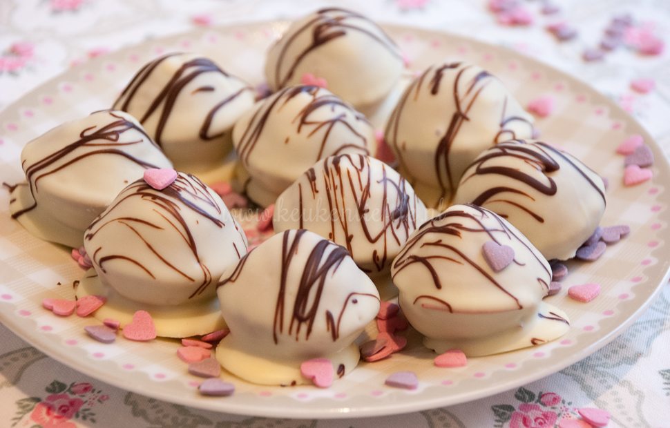 Smelt de pure chocolade au bain-marie, of in de magnetron en drizzle over de choco-cakebollen. In de video zie je hoe dit makkelijk gaat.