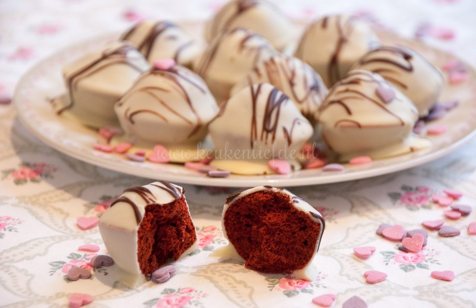 Laat de red velvet choco-cakebollen volledig uitharden. Bewaar daarna op een koele, donkere plek — liever niet in de koelkast, dan wordt de chocolade dof.