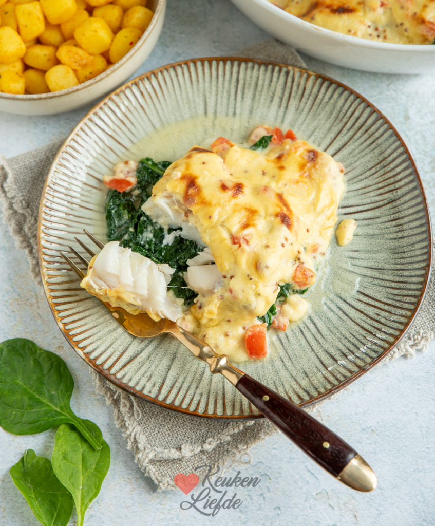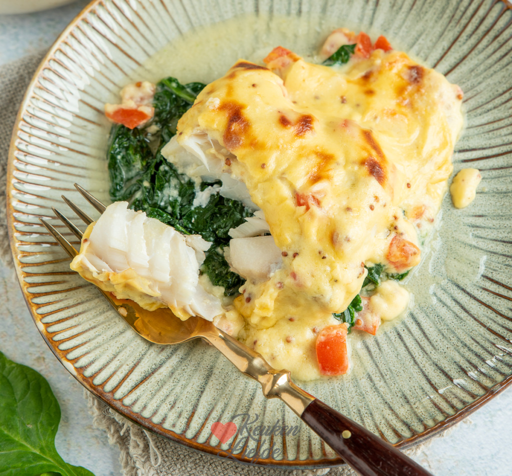 Mornay-saus is een bechamelsaus waar kaas (vaak Gruyère of Parmezaan) aan is toegevoegd. Deze saus smaakt heerlijk bij de spinazie en vis. Voor wat extra pit voeg ik een vleugje mosterd toe en wat blokjes tomaat voor de kleur.