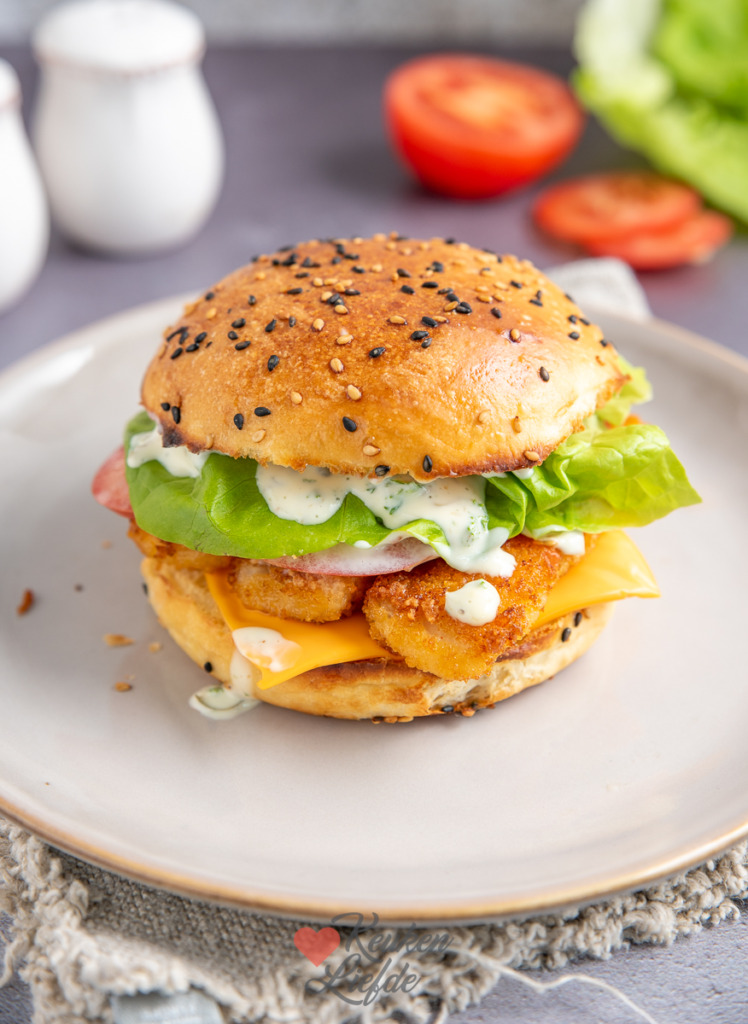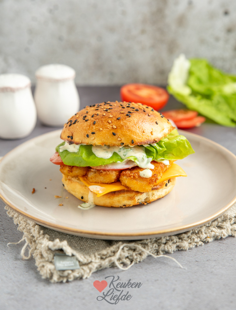 Een lekkere variant op het broodje hamburger is deze visburger met vissticks en tartaarsaus. Ik gebruik hiervoor mijn zelfgemaakte brioche hamburgerbroodjes en ook de tartaarsaus maak ik zelf. Dat is makkelijk en lekker. De vissticks kun je kant-en-klaar kopen, zelf maken, of vervang ze door een visburger. Net waar je zin in hebt. Zie ook onderstaande tip voor een heerlijke vega variant!