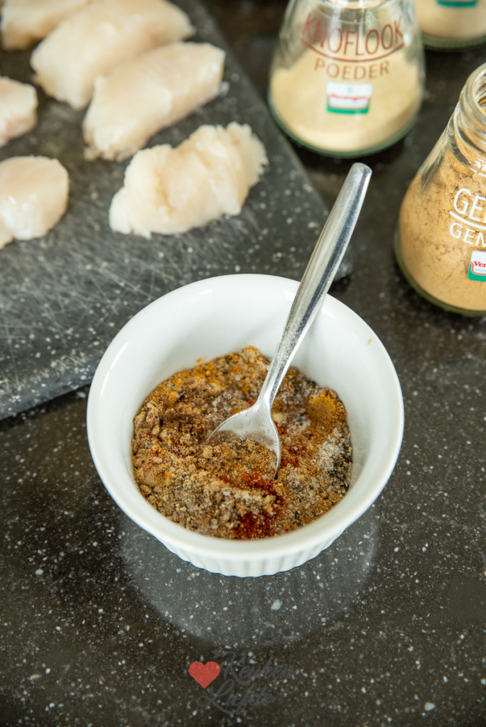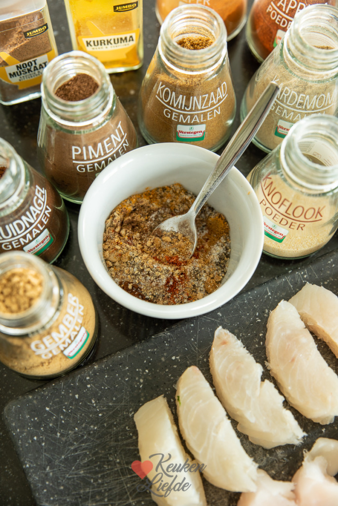 Viskruiden. Met een uitgebreid assortiment aan specerijen en kruiden in mijn keukenkastje hoef ik nooit kruidenmixen te kopen. Dat wil niet zeggen dat ik die niet in huis heb, gemak dient tenslotte de mens. Maar het liefst maak ik kruidenmixen zelf. Kant-en-klare kruidenmixen vind ik vaak erg zout. Aan deze zelfgemaakte viskruiden voeg ik geen zout toe. Ik bestrooi de vis eerst op het oog en op gevoel met zout en peper en voeg daarna de kruidenmix toe. Zo is je vis altijd lekker op smaak.