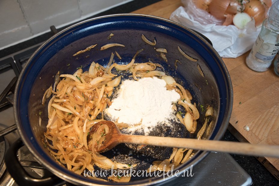 Verhit wat extra boter in de braadpan en bak de uien in het braadvet van het vlees totdat ze beginnen te kleuren. Voeg de knoflook en tijmblaadjes toe en bak even mee. Voeg nog een extra kneep boter toe en 2 el bloem. Bak al roerend op middelhoog vuur verder, totdat de bloem gaar is — dit duurt minimaal 2 minuten! De bloem moet volledig oplossen in de boter, als de bloem zichtbaar blijft voeg dan nog wat extra boter toe.