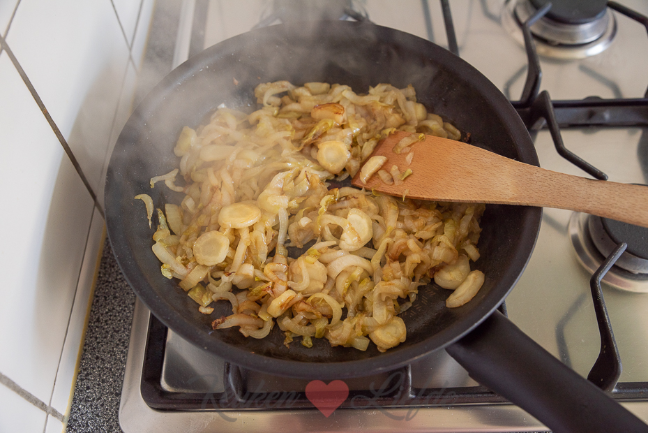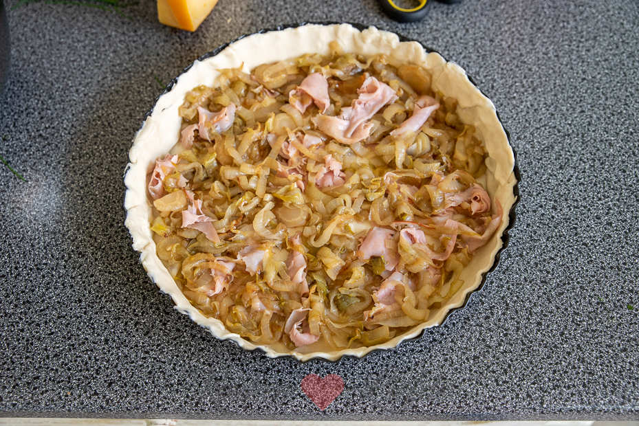 De witlof en ham worden eerst gebakken in de koekenpan voor een lekkere smaak. Daarna gaan ze samen met de romige eivulling en kaas in de bakvorm in de oven. Je kunt dit al voorbereiden en de quiche afgedekt in de koelkast bewaren. Voordat je wilt eten hoef je de quiche alleen maar af te bakken in de oven.