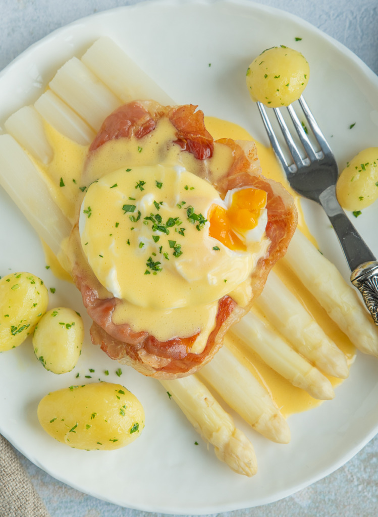 Na een jaar wachten kunnen we eindelijk weer genieten van het witte goud. Hoe eet jij ze het liefst? Ik heb in de loop der jaren al behoorlijk wat aspergegerechten met je gedeeld, maar de klassieke variant met ham, ei en hollandaisesaus blijft toch wel mijn favoriet. Toch geef ik er dit keer een kleine twist aan met krokant uitgebakken parmaham en een gepocheerd ei. De hollandaisesaus maak ik zelf, dat is heel makkelijk en superlekker. Vind je een gepocheerd ei en zelfgemaakte hollandaisesaus toch teveel gedoe, dan kun je ze vervangen door een (zacht) gekookt ei en kant-en-klare hollandaisesaus. Dat is nog steeds genieten.