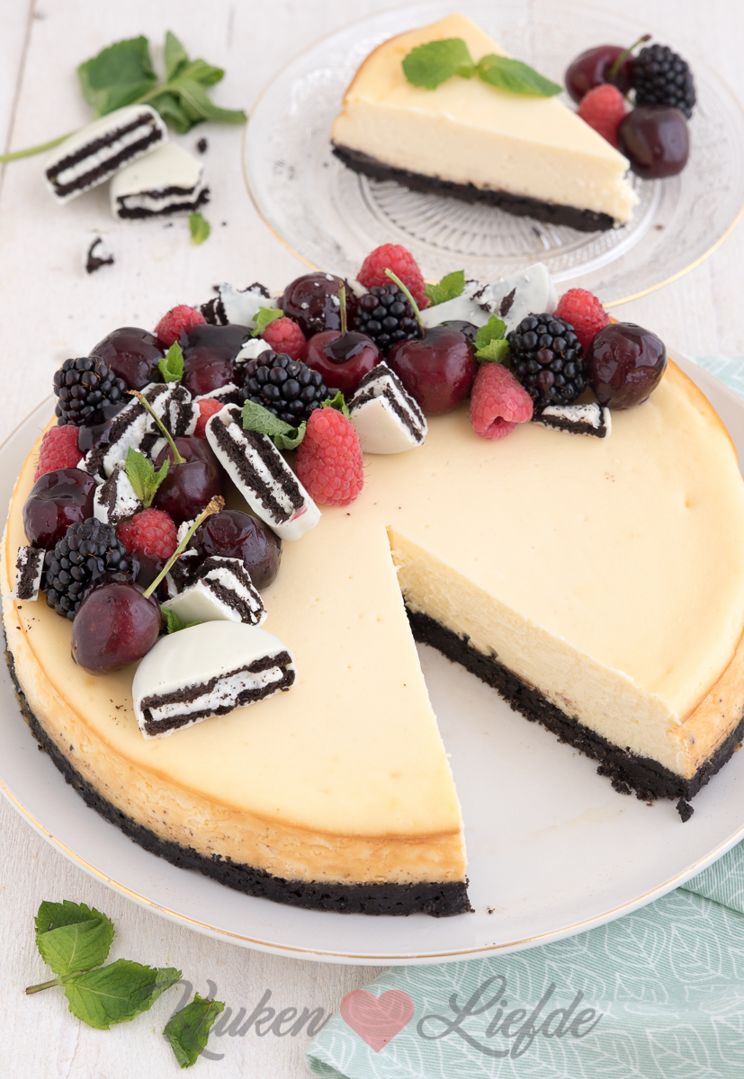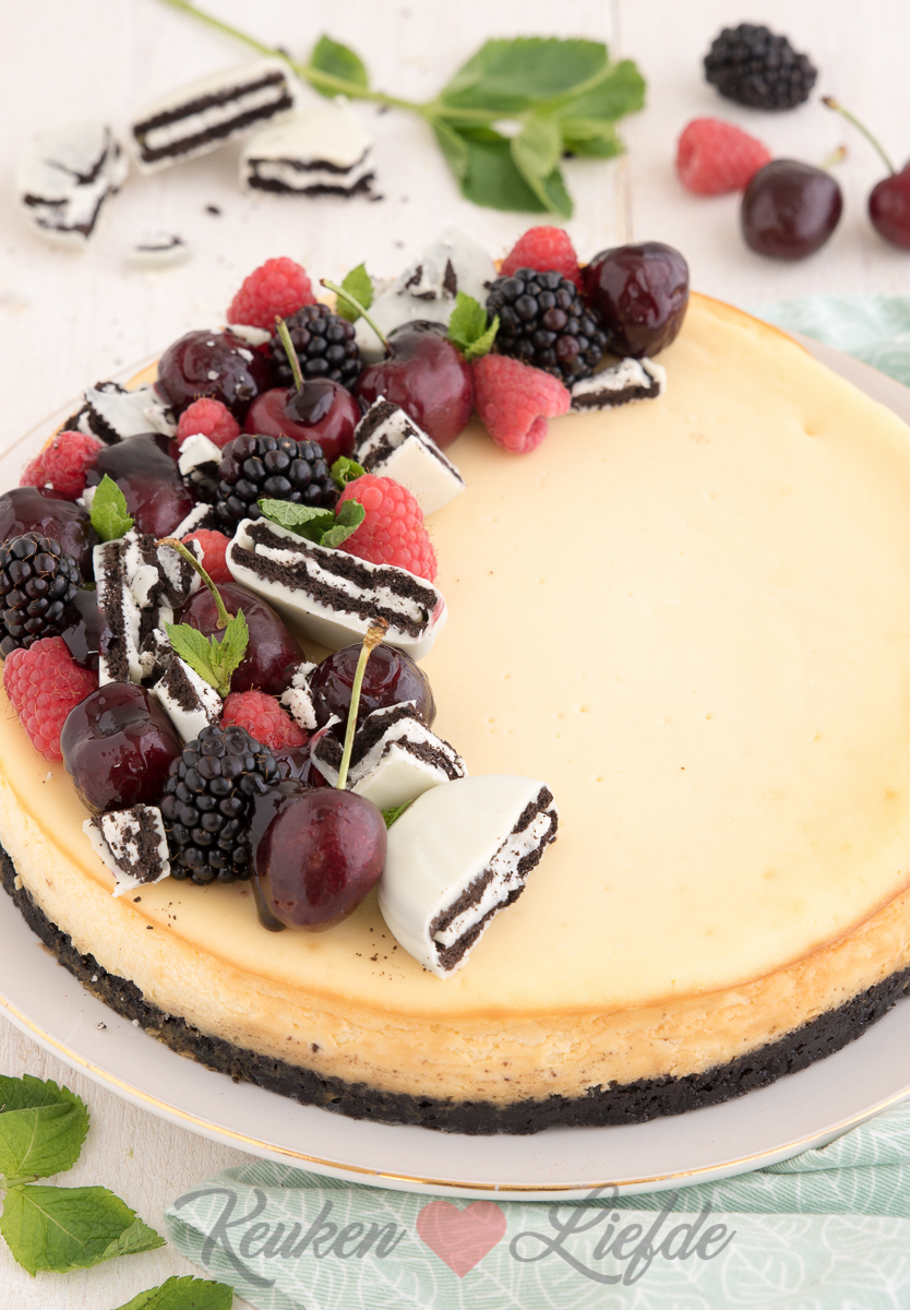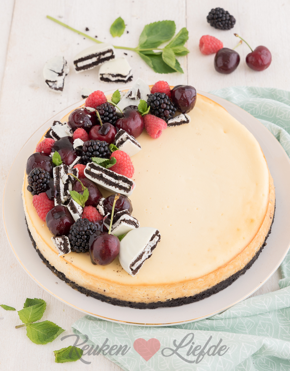 Vroeger was monchoutaart met kersenvlaaivulling mijn onbetwiste taartfavoriet, maar inmiddels is de lijst wat langer. Deze witte-chocoladecheesecake met oreobodem mag op de favorietenlijst niet ontbreken. Gewoon zo smaakt hij al heerlijk, maar gegarneerd met vers zomerfruit en witte-chocoladeoreo’s kan het smulfeest pas echt losbarsten!
