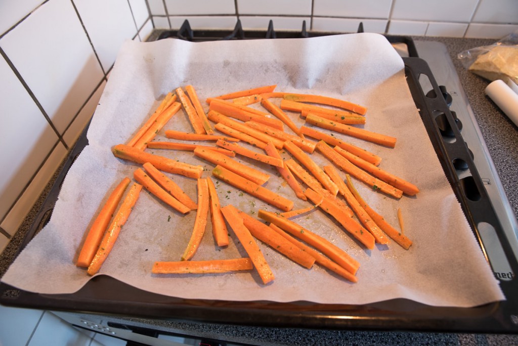 Bak de wortelfrieten circa 20 minuten in het midden van de oven tot ze goudbruin zijn. Draai ze halverwege de baktijd een keer om.