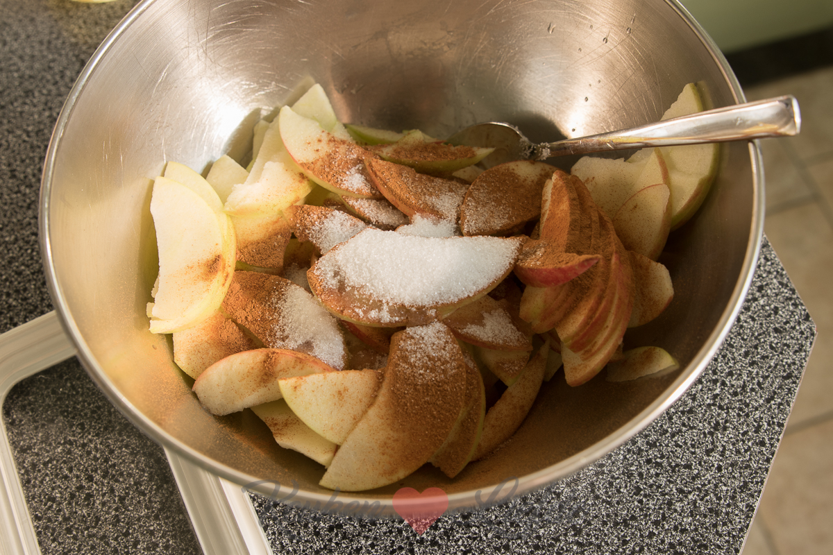 Schil de appels en verwijder het klokhuis. Snijd de appels in dunne plakjes en meng ze in een kom met het kaneelpoeder, citroensap en 1 eetlepel suiker. Zet opzij.