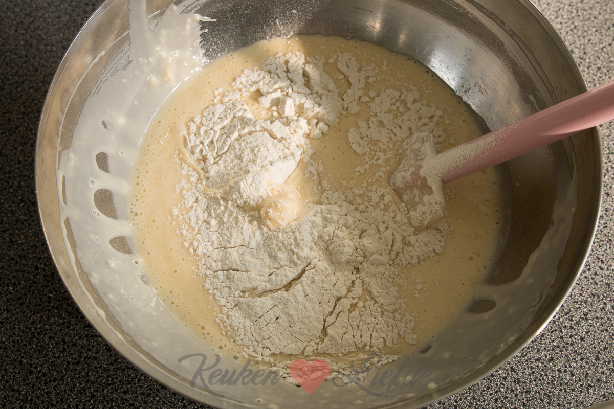 Roer de bloem, het zout en het bakpoeder in een kom door elkaar. Zeef het bloemmengsel in twee porties al zevend boven de kom met beslag en spatel er luchtig doorheen.