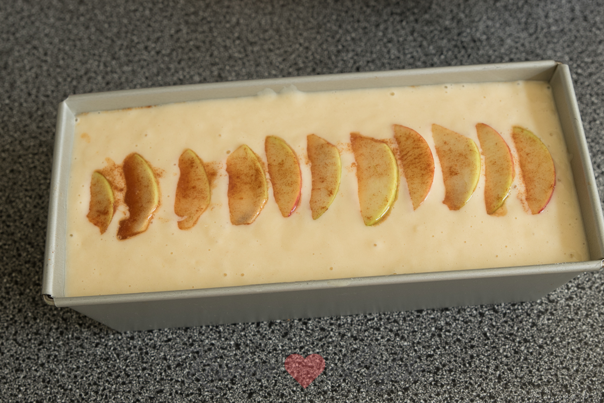 Schenk een laagje beslag in het cakeblik en bedek met een laagje appel. Bedek met een laagje beslag en opnieuw een laagje appel. Herhaal deze laagjes tot het beslag en de appel op is. Eindig met beslag en een paar plakjes appel.