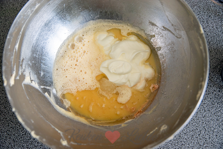 Klop de eieren een beetje los in een kom. Mix de olie en suiker een halve minuut op middelhoge snelheid. Klop op lage snelheid het ei door het beslag. Voeg de yoghurt en vanille toe en klop op lage snelheid glad. Meng in een kom de bloem, het bakpoeder en zout en zeef boven de kom. Mix op lage snelheid kort door het beslag tot het gemengd is, niet langer mixen dan nodig is.