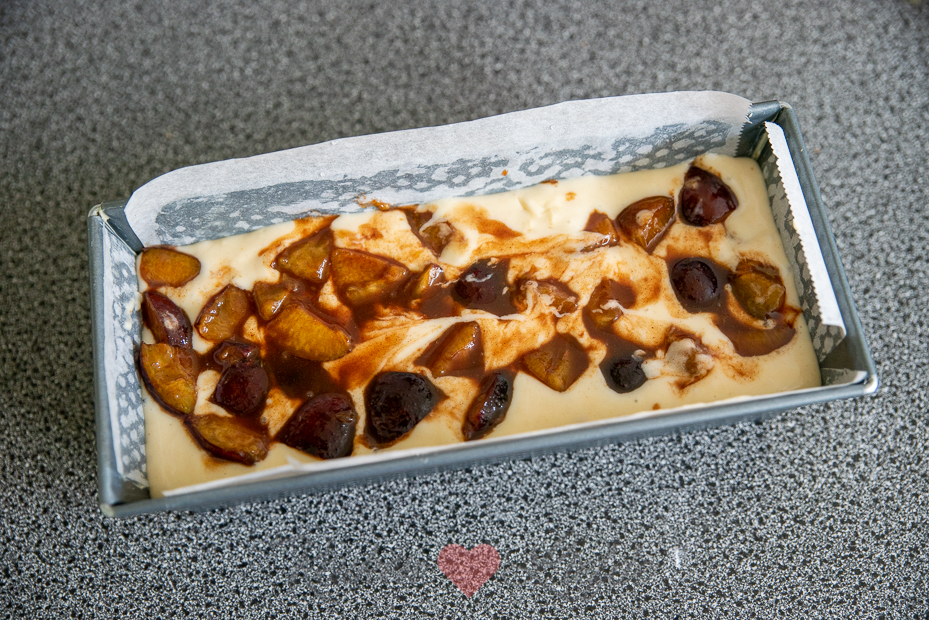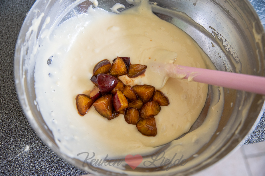 Meng de pruimen met de suiker en speculaaskruiden. Spatel de helft van de pruimen door het cakebeslag en giet het beslag in de vorm. Strijk de bovenkant glad en verdeel de overige pruimen erover. Bak de cake in het midden van de oven in 60 tot 70 minuten gaar. Controleer of de cake gaar is met een prikker, komt deze er schoon uit, dan is de cake gaar.