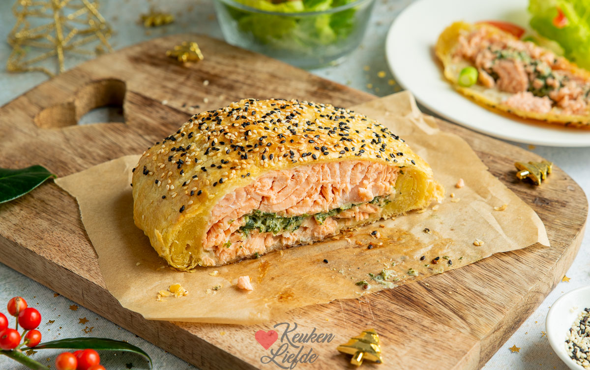 Met kerst een spektakelstuk op tafel zetten zonder al teveel moeite? Deze zalm in bladerdeeg met spinazie- en roomkaasvulling is eenvoudig om te maken en heerlijk. Lekker om te serveren met hollandaisesaus, geroosterde krieltjes en een salade met avocado. Groenten die lekker zijn om hierbij te serveren zijn spinazie à la crème, gebakken champignons en peultjes.