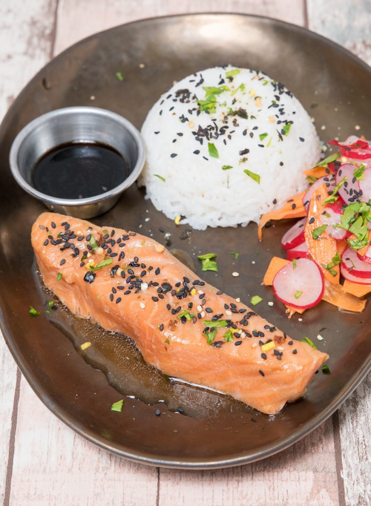 Zalm in sojasaus-marinade met rijst en rauwkost