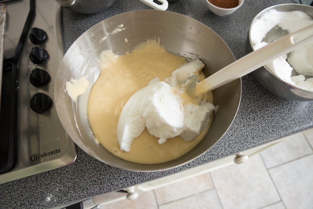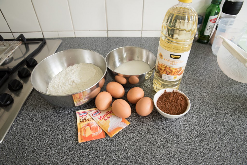 Verdeel het beslag in 2 gelijke porties en voeg aan één deel de cacao toe. Spatel door het beslag.