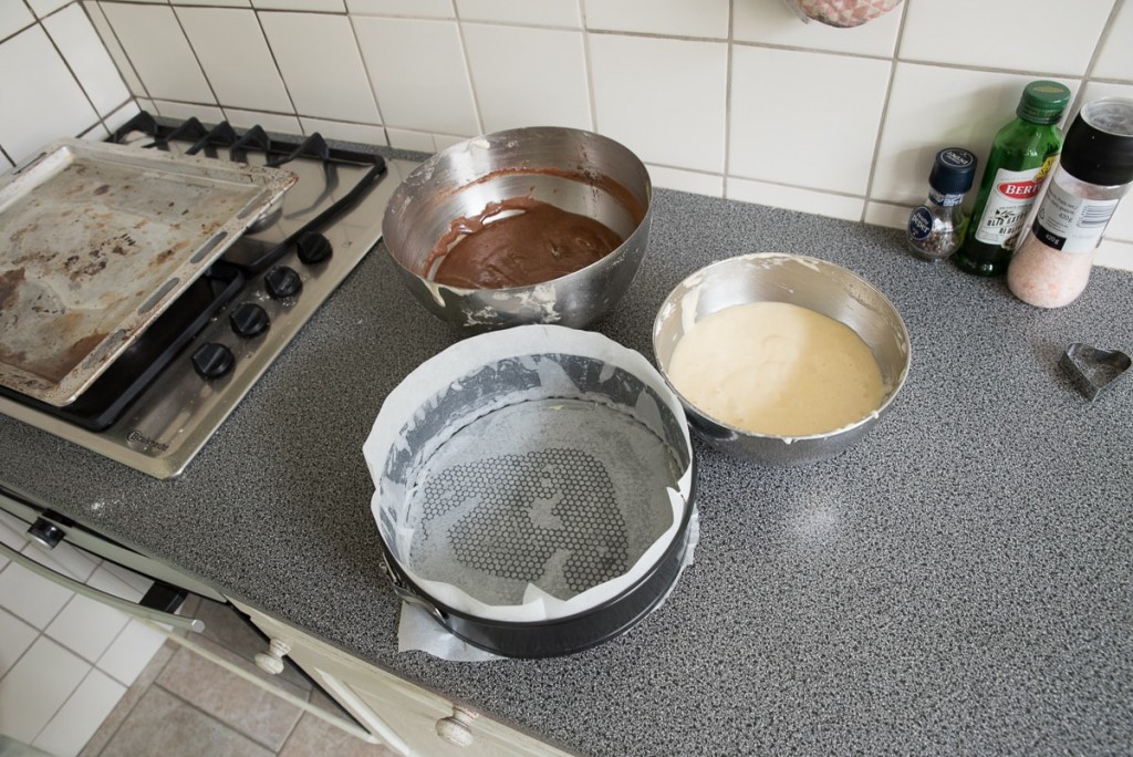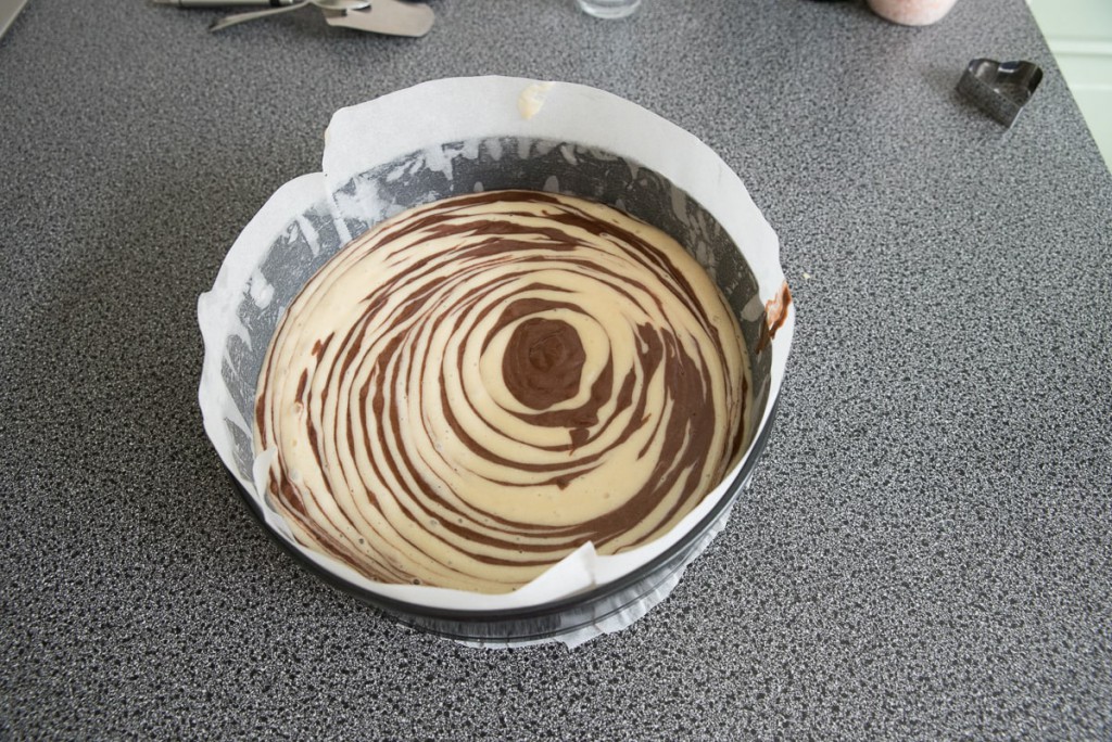 Schep twee eetlepels van het gele beslag in het midden van de springvorm. Schep daarna twee eetlepels van het bruine beslag in het midden van het gele beslag. Schep nu weer twee eetlepels geel beslag in het midden van het bruine beslag. Blijf dit herhalen tot al het beslag op is. Je hoeft het deeg niet te helpen door het glad te strijken, het zebrapatroon wordt vanzelf zichtbaar.