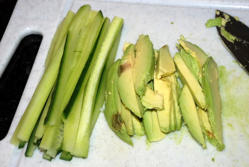 - 0,5 komkommer en/of 1 eetrijpe avocado, in reepjes