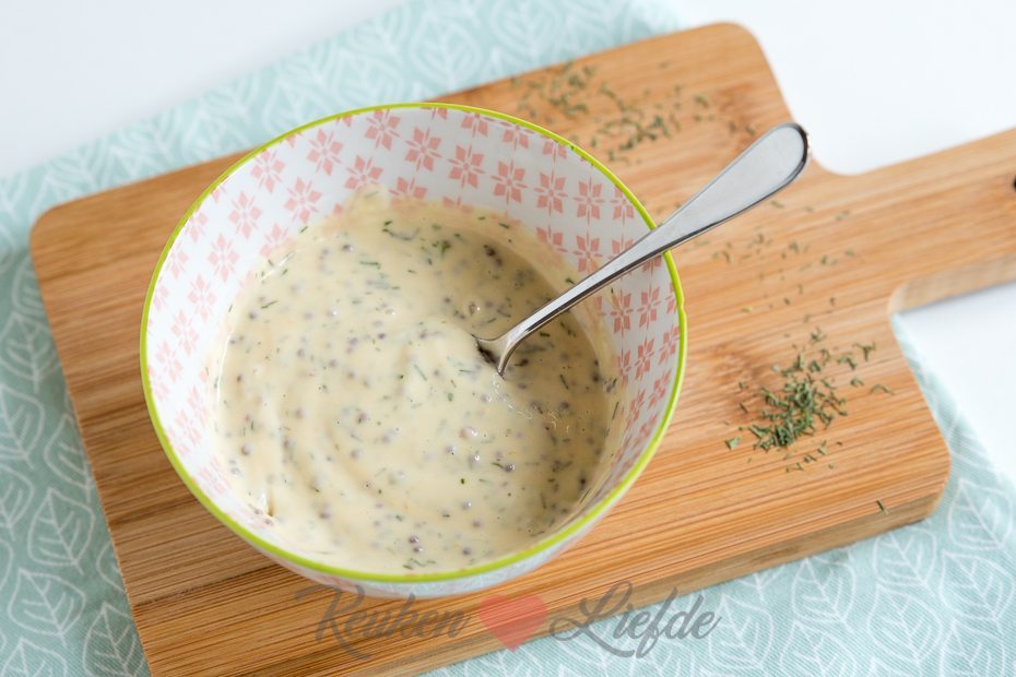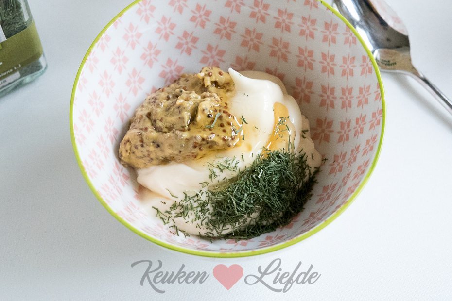 Roer de mayonnaise, mosterd, honing en dille door elkaar en proef of je hem lekker vindt. Als je wilt kun je nog wat extra honing of dille toevoegen.