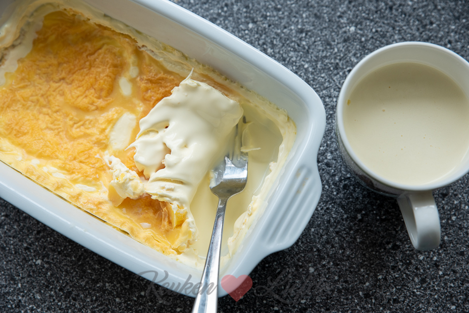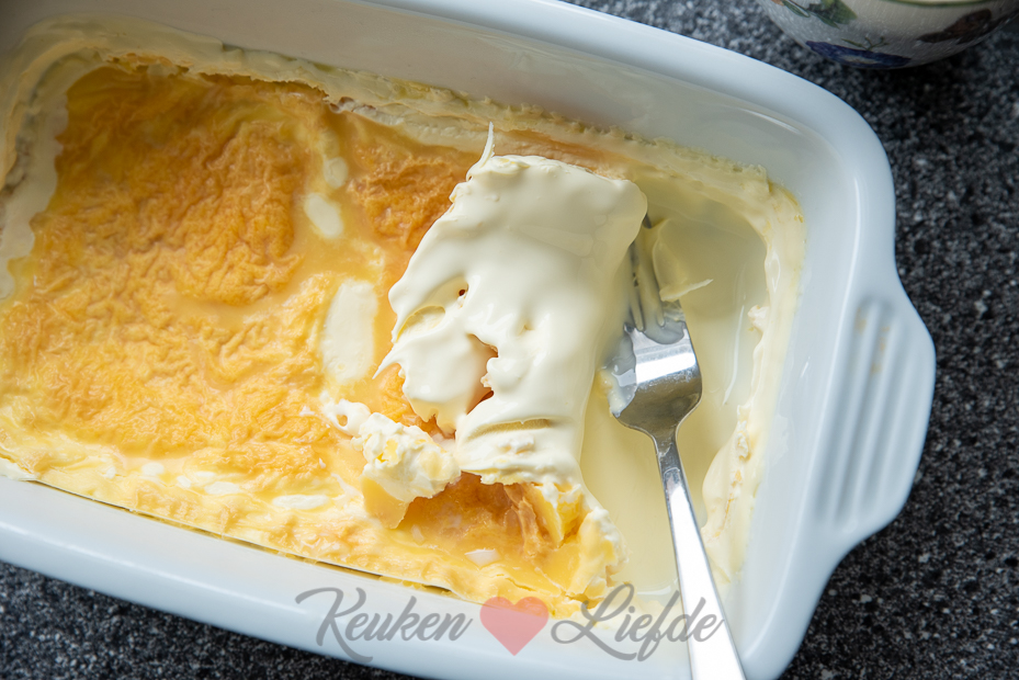 Trek de dikke korst die zich bovenop gevormd heeft een stukje opzij en giet de vloeibare room onderin de schaal eruit. Vang deze room op in een kannetje en bewaar hem in de koelkast. Je kunt er bijvoorbeeld scones mee te maken, of gebruik het net zoals (kook)room om een saus of gerecht mee te verrijken.