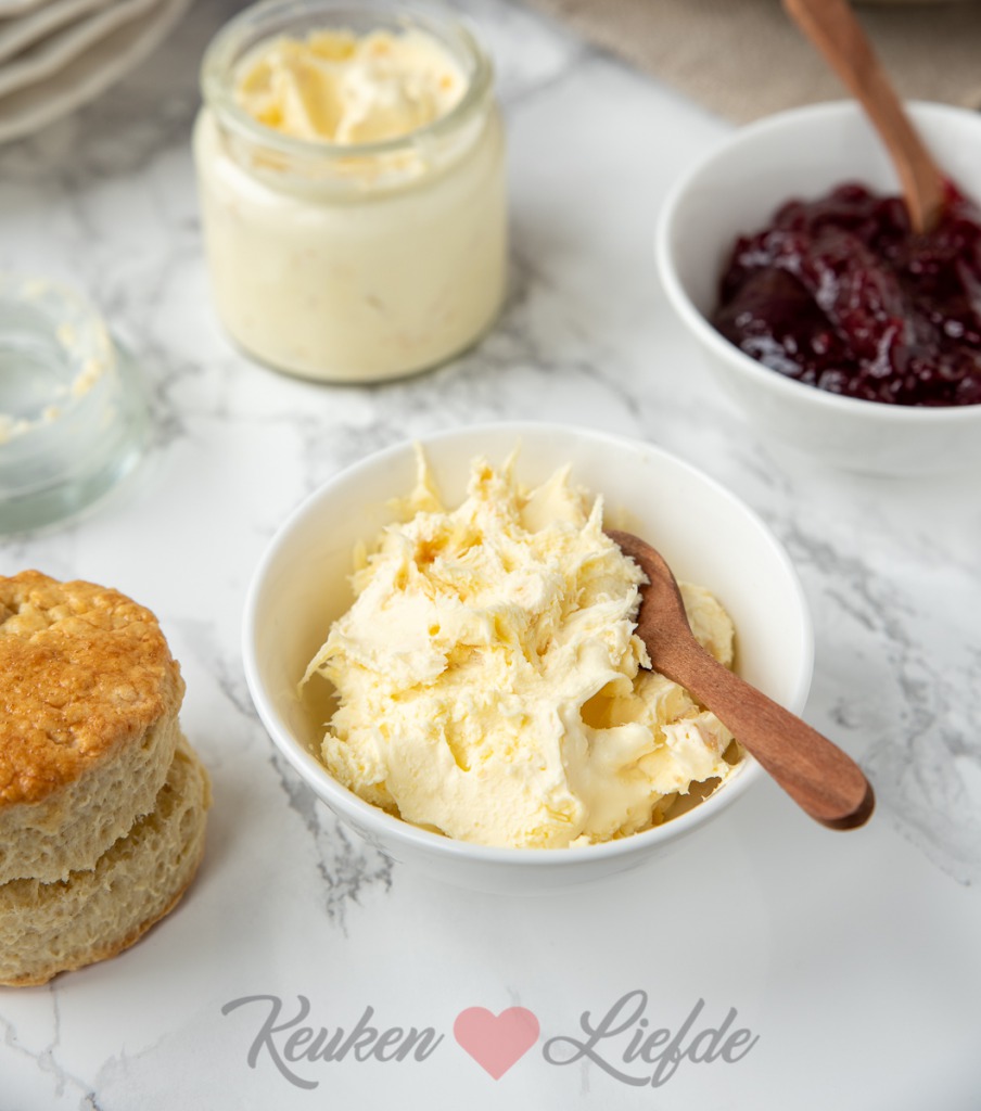 Scones met clotted cream en jam; ze mogen niet ontbreken bij een Engelse high tea. Maar wij zijn er ook dol op! Nu zijn scones gelukkig heel makkelijk zelf te maken (dit recept!). Maar ook clotted cream kun je makkelijk zelf maken. Vergeet al die snelle clotted cream varianten gemaakt met mascarpone; die halen het qua smaak niet bij het origineel. Voor de enige echte én allerlekkerste clotted cream heb je alleen slagroom nodig. En een beetje liefde en geduld. 🙂 Waar wacht je nog op? Hup, aan de slag!