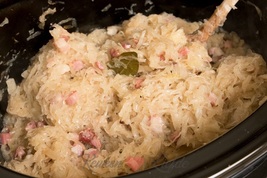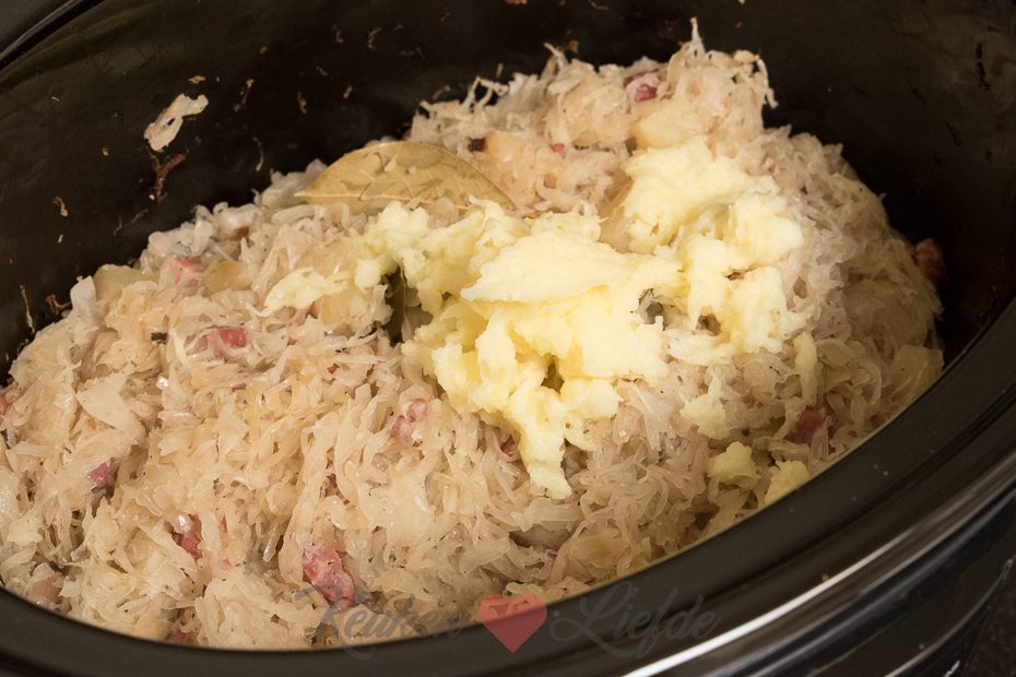 Toch heb ik een vraag: bij het bereiden van de zuurkool houd je de helft van de ananasblokjes achter, de andere helft gebruik je voor de decoratie bij opdienen. Wanneer gaat de eerste helft bij de zuurkool? Al tijdens het ‘slowcooken’ of pas over de zuurkool voor de gehaktlaag erover gaat?