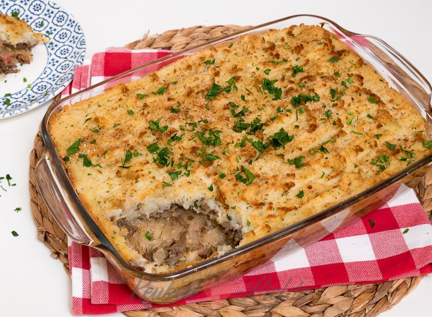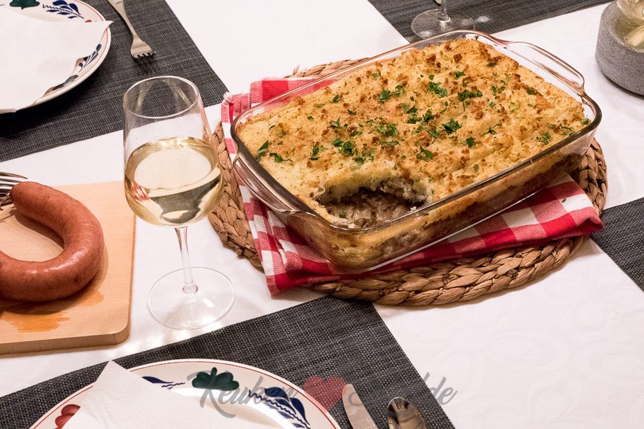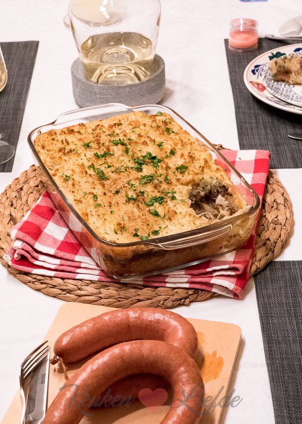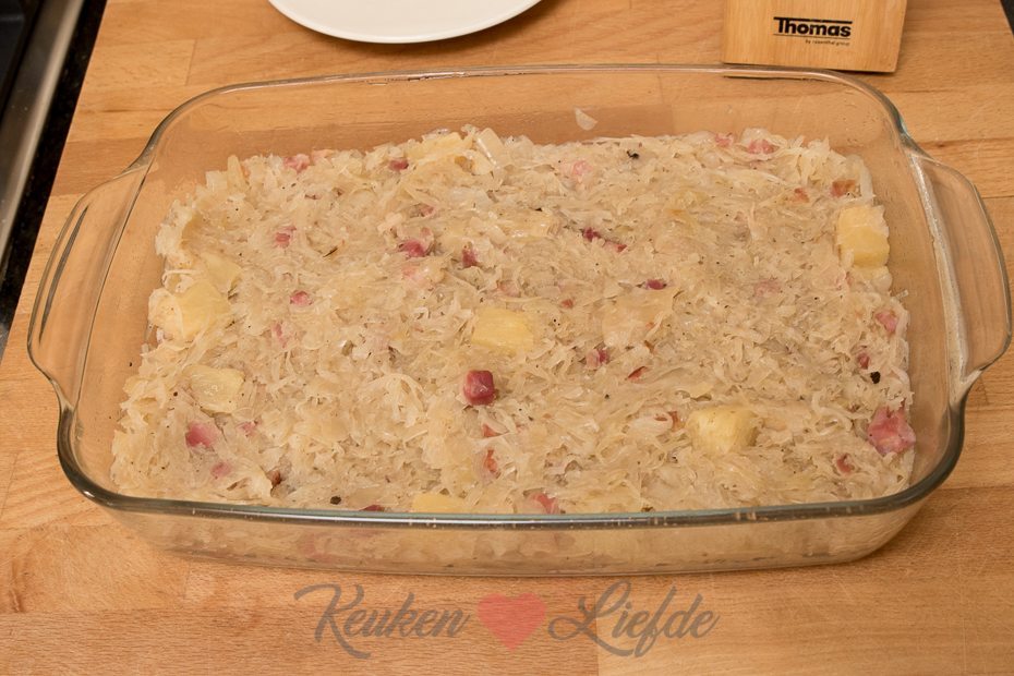 Zuurkoolovenschotel met gehakt en aardappelpuree
